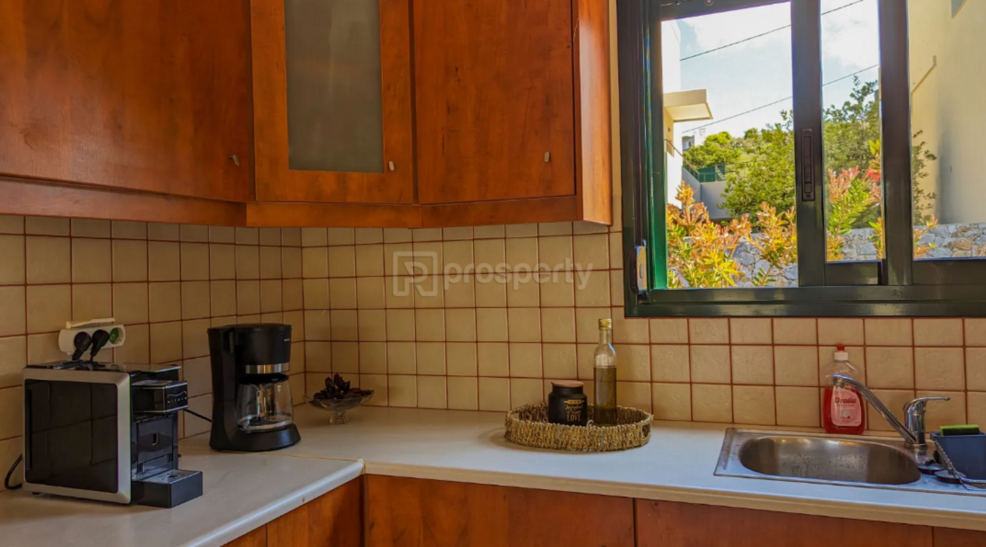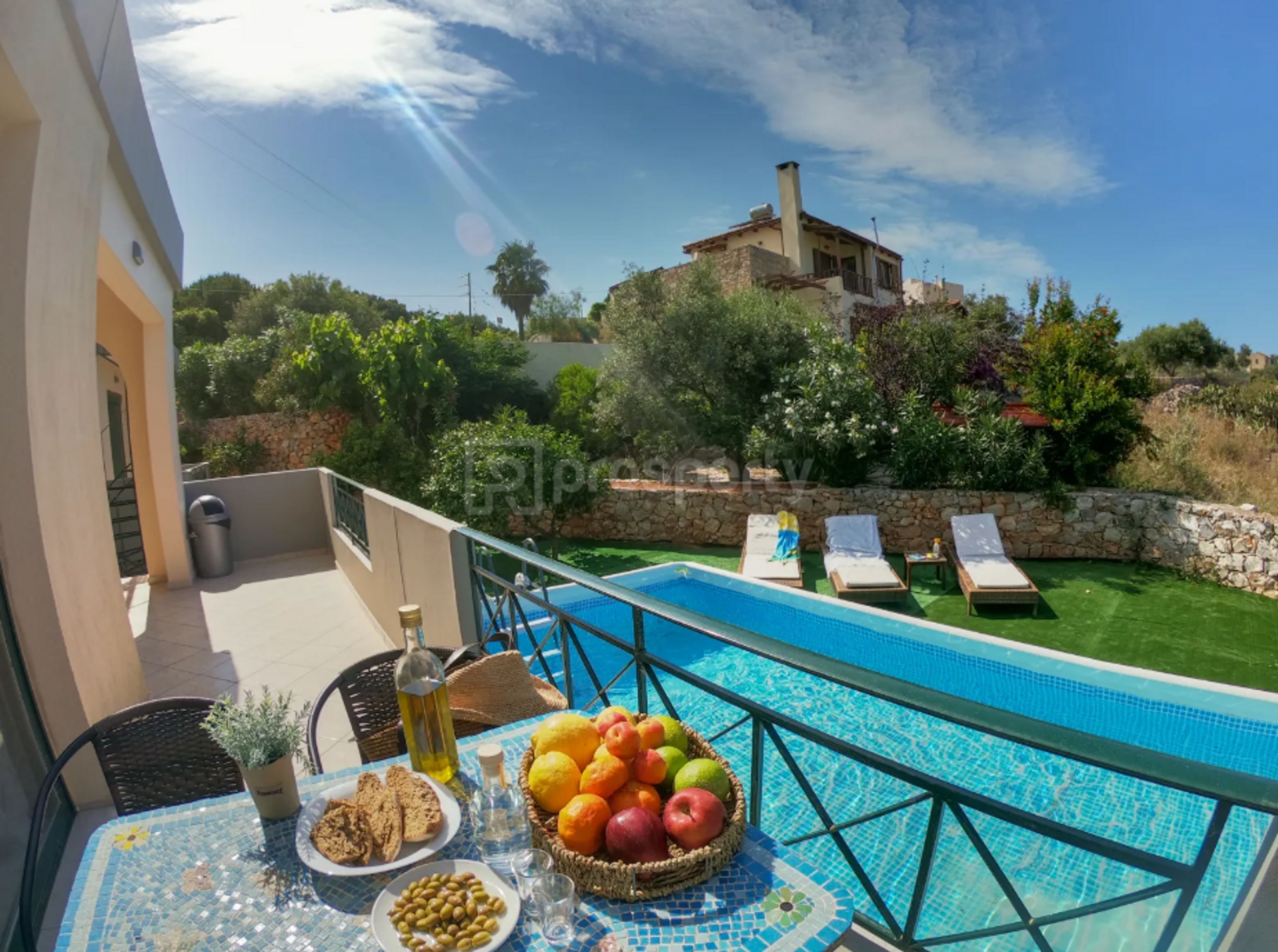 Η ιδιοκτησία είναι περιτριγυρισμένη από πέτρινη περίφραξη, προσφέροντας ασφάλεια και ιδιωτικότητα. Ο κήπος αποτελείται από καρποφόρα δέντρα όπως κερασιά, αχλαδιά, γκρέιπφρουτ και μούσμουλα, παρέχοντας φρέσκα φρούτα και σκιά κατά τους καλοκαιρινούς μήνες.