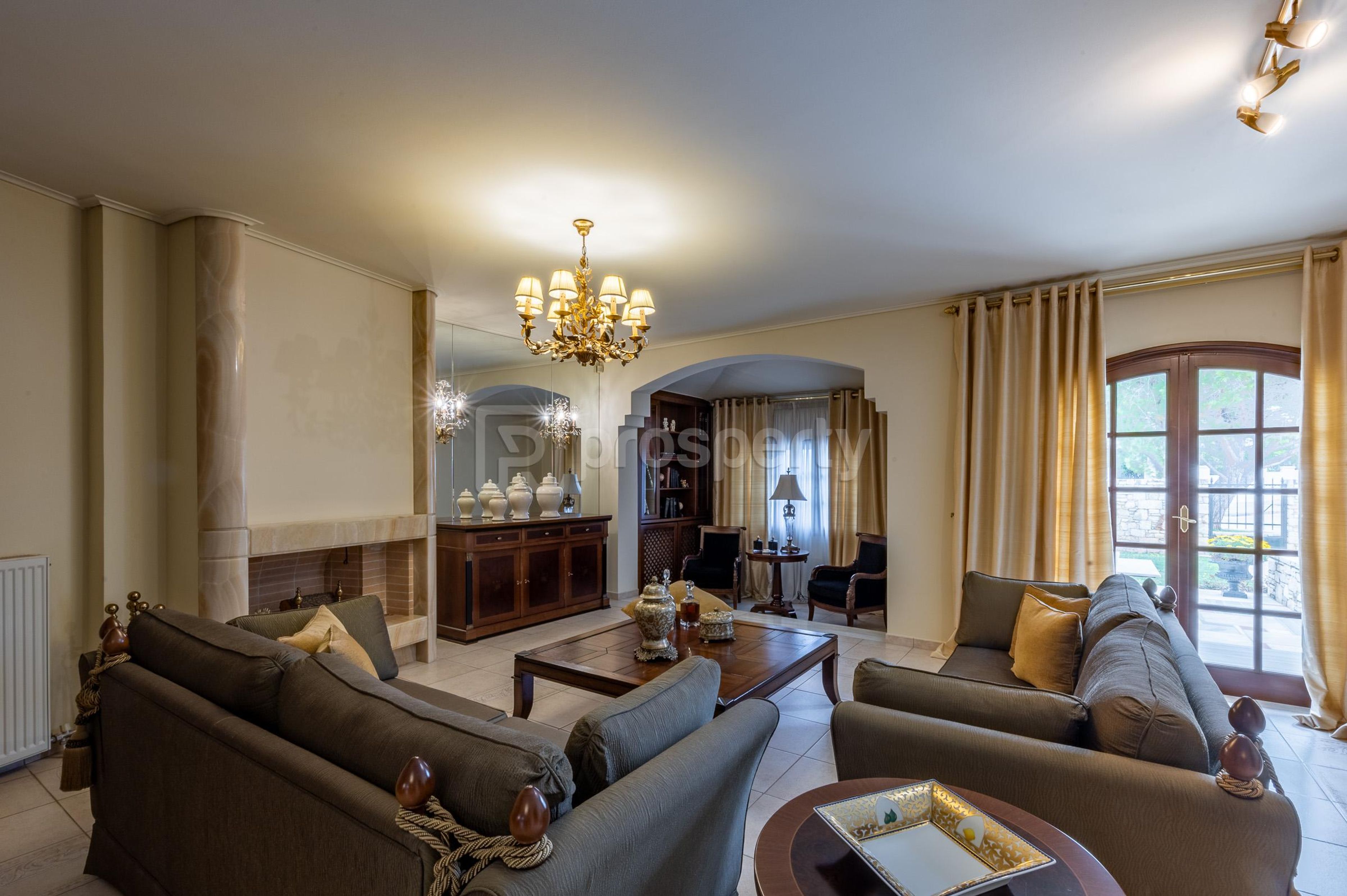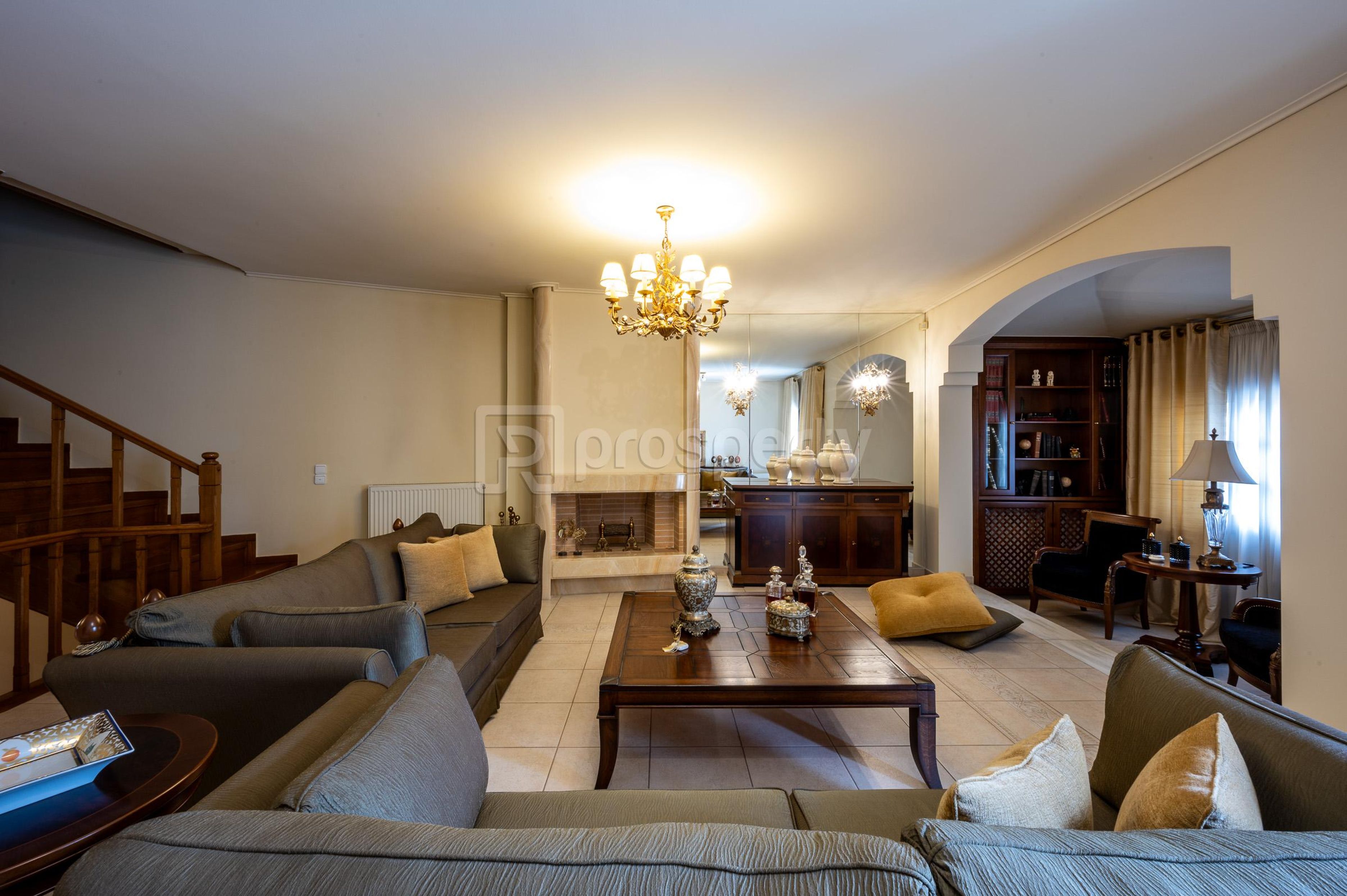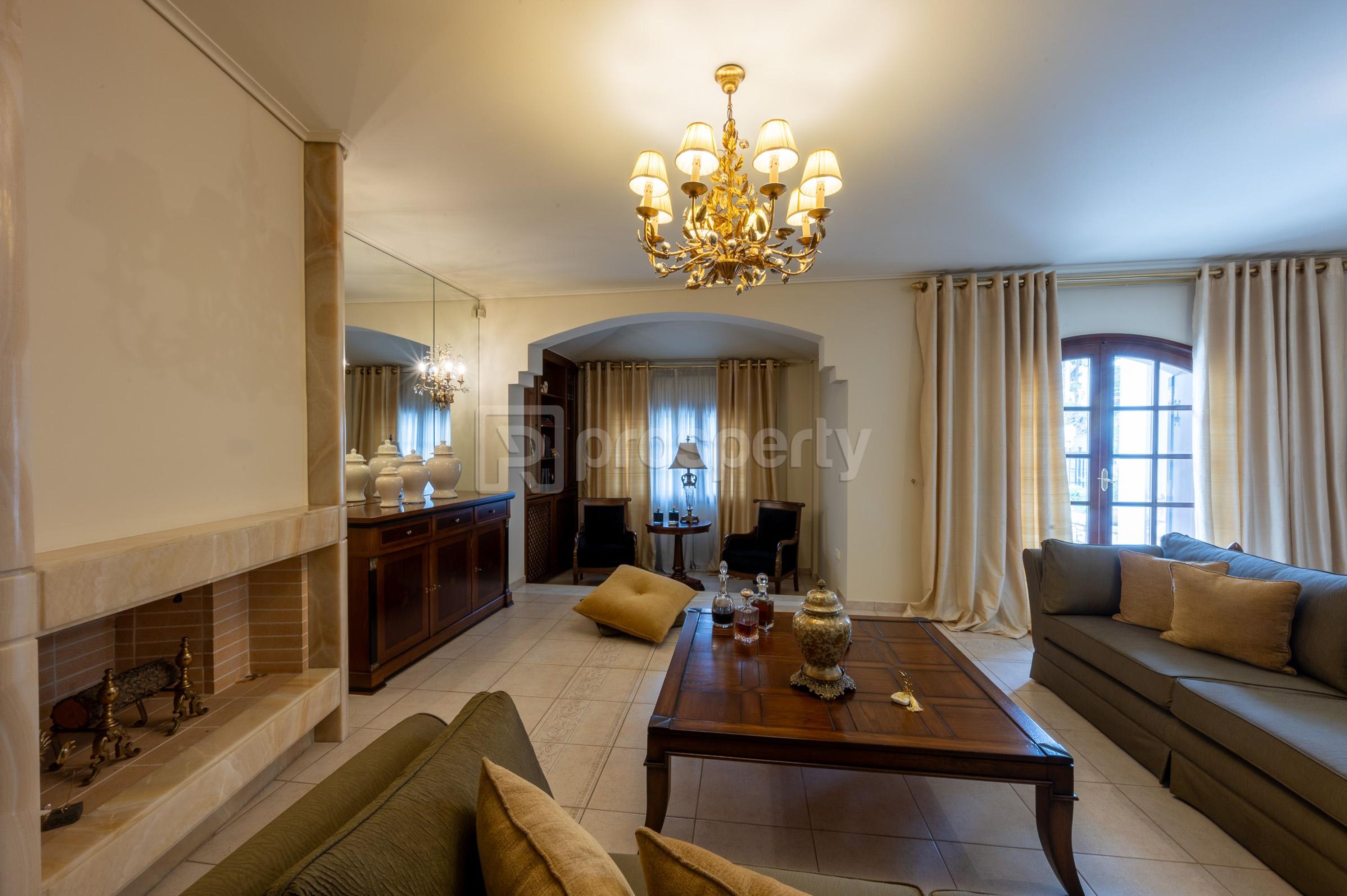Luxurious, stately maisonette, of excellent construction, is located on a corner plot with a total area of 1000sqm with 4 residences, in a privileged area of Nea Kifissia on a quiet street, near the market of Tatoiou street which facilitates everyday life. The property stands out from the outside, from its neoclassical architecture, which combines stone-built balconies and solid wooden frames, to the beautiful and well-kept garden. On the ground floor there is a reception area with a fireplace decorated with rare onyx type marble, a dining room, and an open plan kitchen. The built-in composition of the kitchen is made of solid wood, handmade by a top carpenter. On this level there are terraces with access to a lawned garden. Climbing the wooden, solid oak staircase with a handrail, we reach the first floor. Here we find two bedrooms with a large bathroom, and a master bedroom with its own spacious bathroom. All rooms have oak floors, balconies overlooking the garden, are bright and have built-in massive, excellent quality wardrobes. On the upper floor there is a very bright attic with a terrace that can accommodate a comfortable office or gym. Going down the stairs to the basement we find the guest toilet. The basement area has an independent entrance from the garden and consists of a living room with a fireplace, a dining room and a kitchen built by the same carpenter. The property also has gas heating, security doors, double glazing with solid timber frames, large storage, and a laundry room. It is worth noting that the quality of all materials and the construction of the property is excellent.